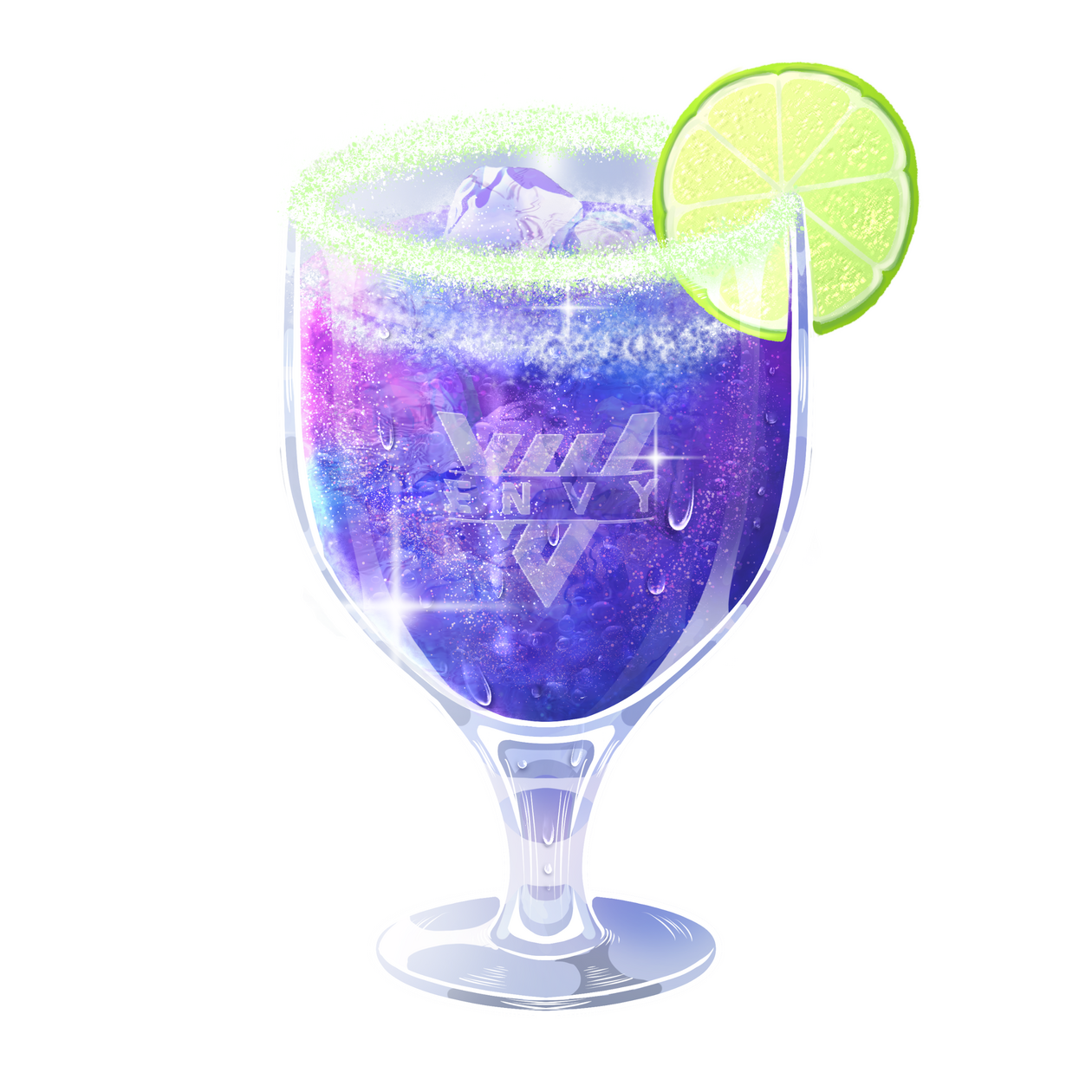 Ingredients: Blue Curaçao, Crème de Cassis, Gin, Lemon juice, edible shimmer dust, sugar and lime.